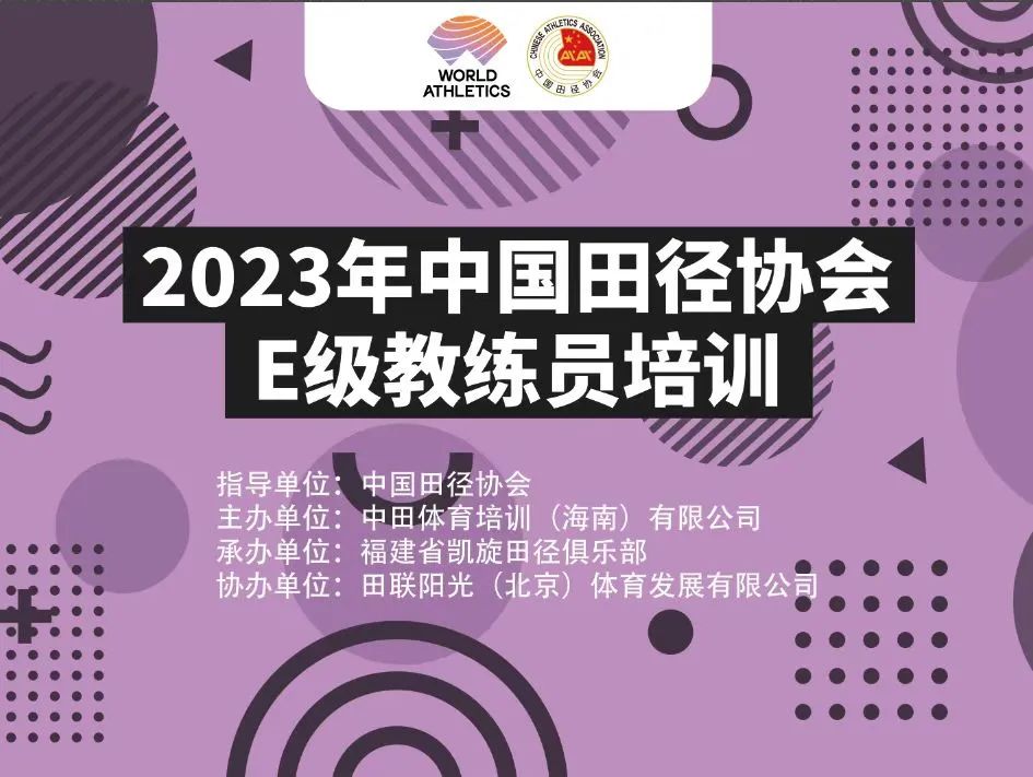 现根据《中国田径协会教练员资质认证体系建设方案》、《中国田径协会教练员资质认证培训管理办法》相关精神,开展为期三天(1月6日—1月8日)的线下2023年中国田径协会E级教练员培训。本次培训活动由中国田径协会指导,中田体育培训(海南)有限公司主办,福建省凯旋田径俱乐部承办,田联阳光(北京)体育发展有限公司协办。