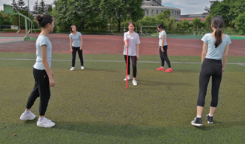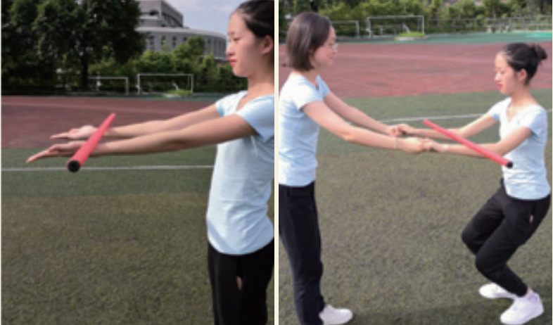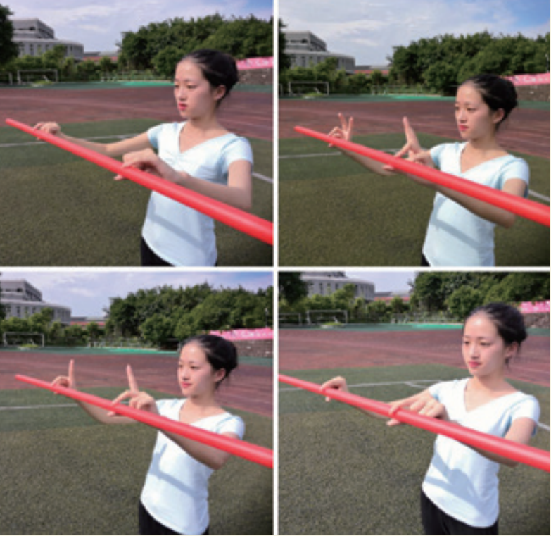 练习方法:单人练习时,通过手臂和手指的配合,控制标志杆在手臂上来回滚动。双人练习时,两人手拉手,面对面站立,通过协作使标志杆在两人的手臂之间来回滚动,并尽量保持更长时间(图5)。