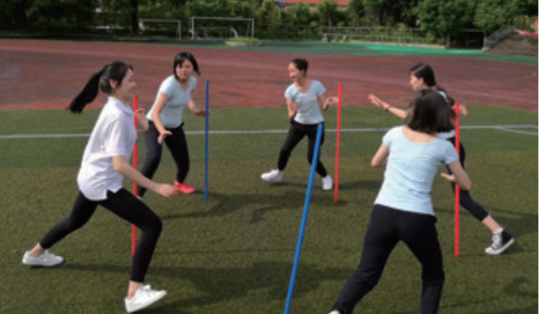 练习方法:每名幼儿手持一根标志杆并使其直立在地面上,当听到指令后,迅速松开自己手中的标志杆,去接住旁边同伴的标志杆,尽量保证所有的标志杆不落地(图4)