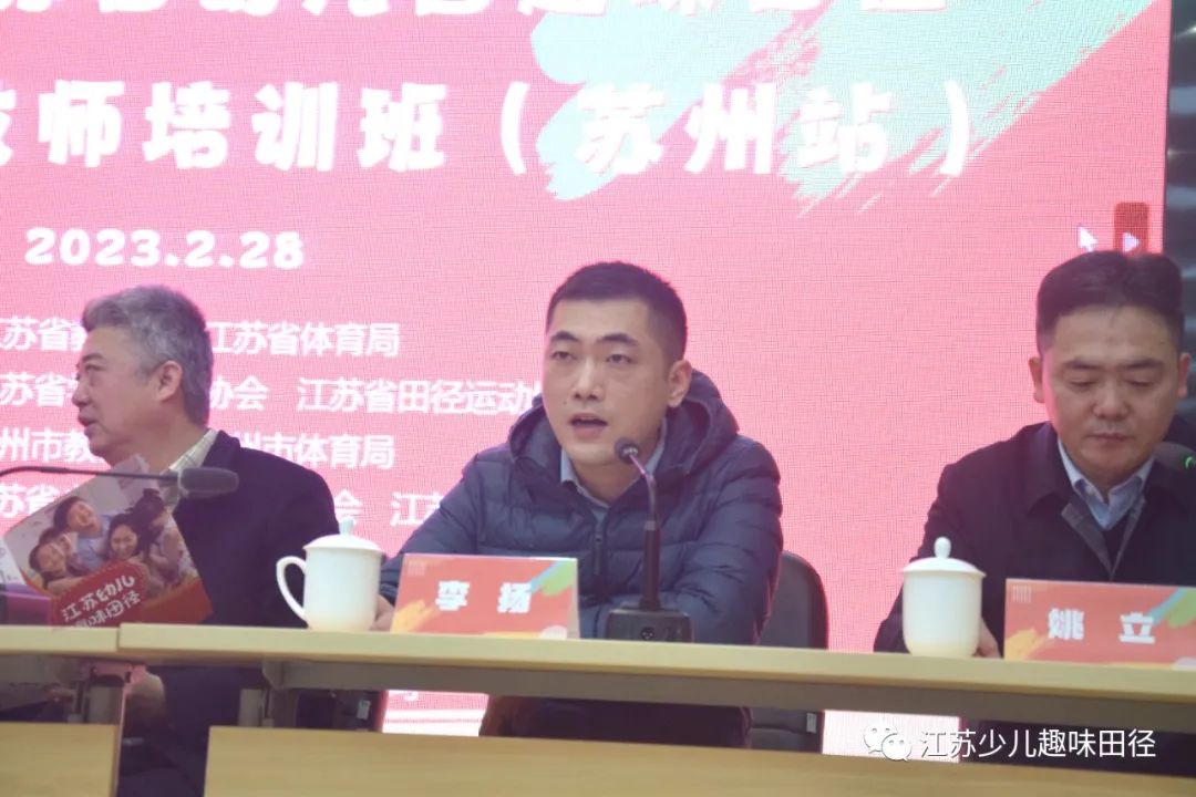 为响应江苏省委办公厅、江苏省政府办公厅印发的《关于全面加强和改进新时代学校体育工作实施意见的通知》,将“学前教育阶段广泛开展趣味田径幼儿体适能游戏活动”列为重点任务,贯彻落实《省教育厅省体育局关于推广少儿趣味田径运动项目的通知》,综合施策建好师资队伍,切实提高教师的专业知识和执教能力。2月28日,江苏省幼儿园趣味田径园长及骨干教师培训班(苏州站)在苏州市教师发展学院举办。江苏省社会体育管理中心主任、江苏省田径运动协会会长 孙谦;江苏田协少儿趣味田径委员会主任、江苏省幼儿体育协会副会长兼秘书长 姜迪;江苏省教育厅体卫艺处主任科员李扬;苏州市体育局副局长程军红;苏州市教育局四级调研员汪涛出席开班仪式。此次培训由苏州市教育局体育卫生与艺术教育处处长姚立主持。