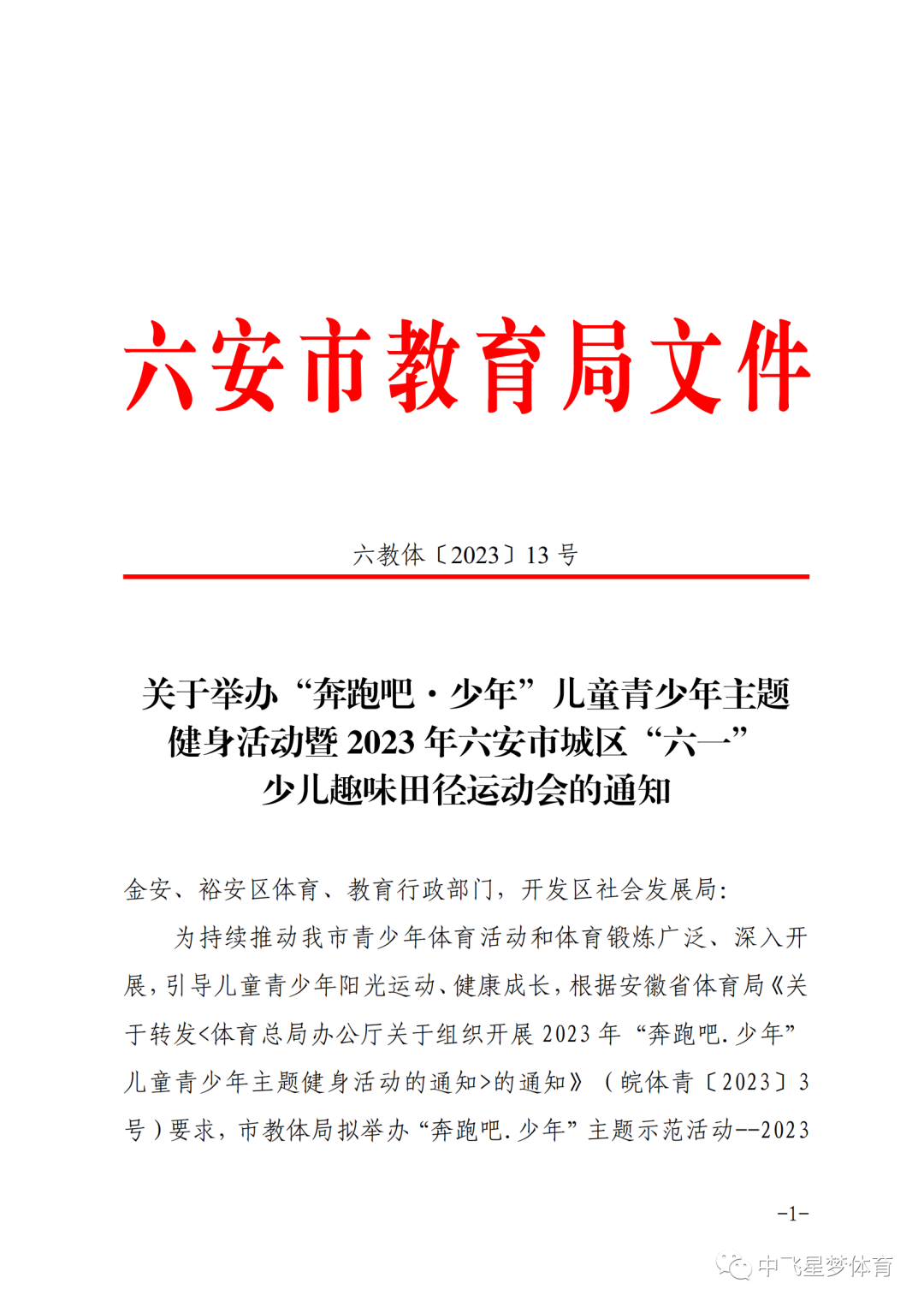 关于举办“奔跑吧·少年”儿童青少年主题 健身活动暨2023年六安市城区“六一”少儿趣味田径运动会的通知