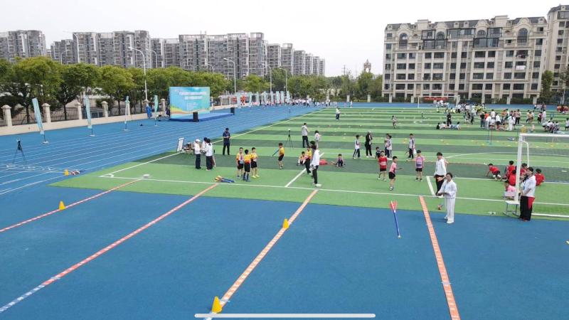 蓝天白云下的绿茵场被分成多个比赛区域,小运动员们个个摩拳擦掌,想在赛场上一试身手。本次比赛分8个组别,设置短跑/跨栏接力、十字跳、投掷软式标枪、一级方程式、3分钟跳绳等8个比赛项目。趣味田径主要是采用短跑、耐力跑、跳跃、投掷等田径的基本形式进行练习,具有很强的游戏性和趣味性。