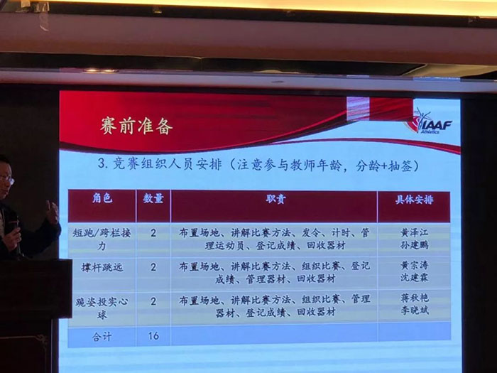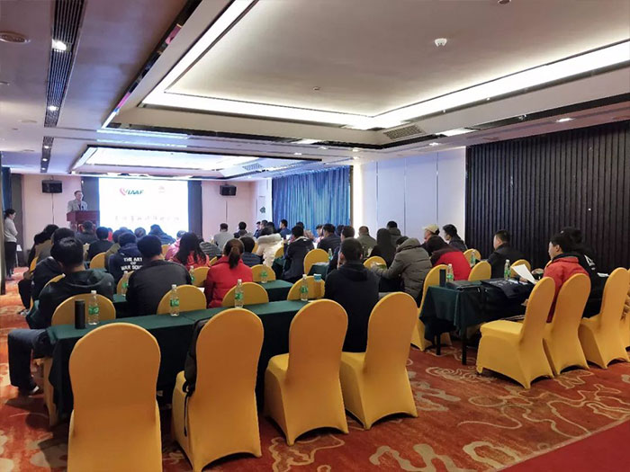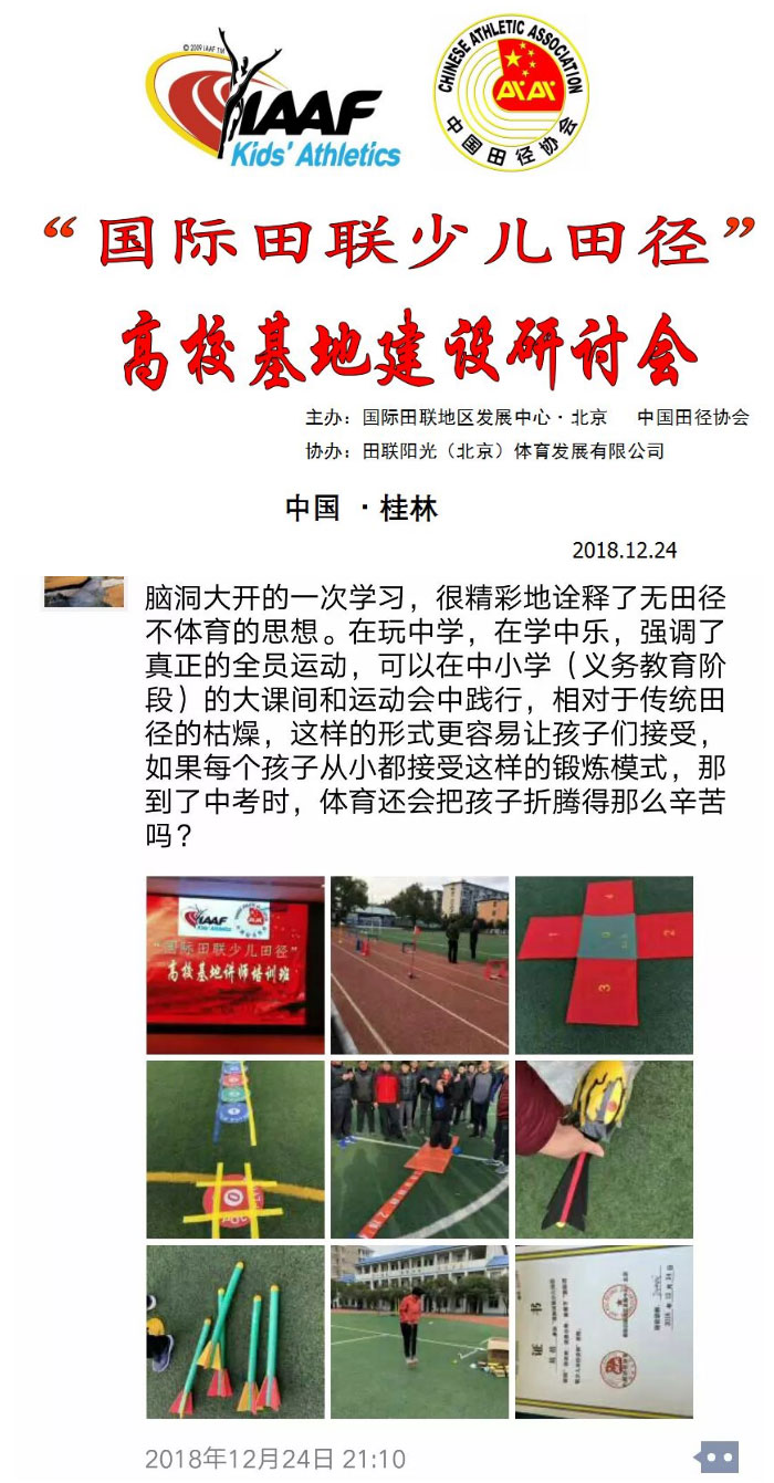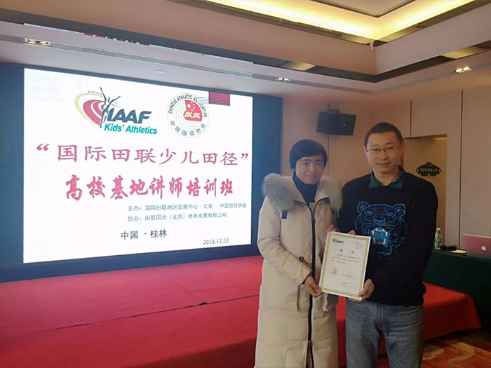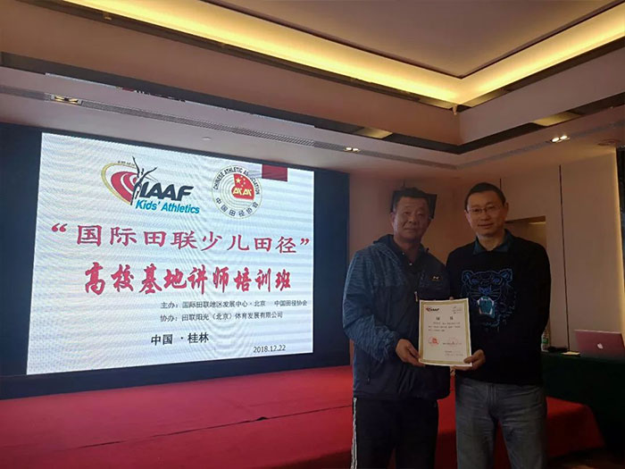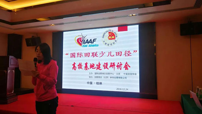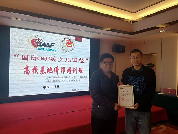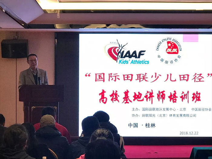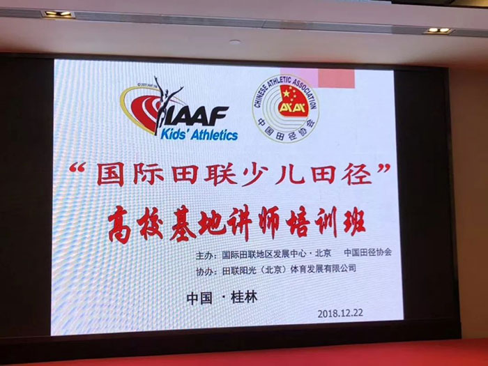 2018年12月22-24日,“国际田联少儿田径”高校基地讲师培训班在广西桂林成功举办。这次培训是为了更好地发挥“国际田联少儿田径推广基地”的作用,满足各基地在推广“少儿田径”过程中的师资需求,经国际田联和亚田联批准,由国际田联地区发展中心·北京和中国田径协会主办,由田联阳光(北京)体育发展有限公司协办。来自全国30多所高校的50名体育专家老师参加了此次培训。国际田联地区发展中心·北京的孙南主任和田联阳光(北京)体育发展有限公司的总经理高永强先生出席了此次活动。孙南主任和高总分别代表主办方和协办方进行了致辞。