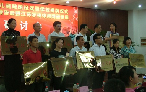 南通师范第二附属小学吴校长、国际田联少儿部高主任为大会致开幕词。江苏省海门市三厂镇中心小学的许校长、江苏省教育学院附属小学的金校长分别介绍了开展少儿趣味田径实验教学所取得的经验。首批十二所国际田联少儿趣味田径实验学校接受了授牌。