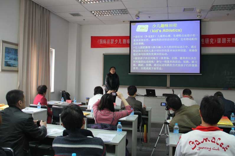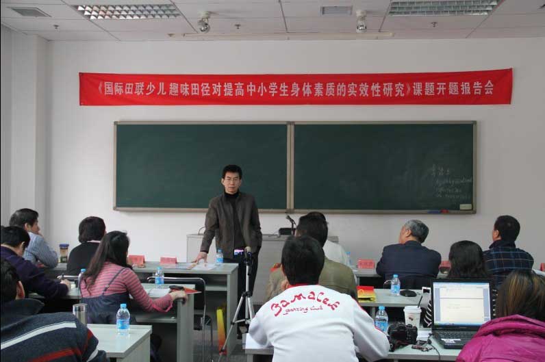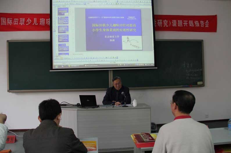 2010年3月19日,全国教育科学“十一五”规划2010年度教育部重点课题《国际田联少儿趣味田径对提高中小学生身体素质的实效性研究》课题开题报告会在北京体育大学培训中心会议室隆重举行。会议由课题负责人北京体育大学教授,国际田联地区发展中心北京执行主任孙南主持,课题组成员北京体育大学教授章碧玉博士做了课题的开题报告。出席开题报告会的领导和专家有中国教育学会体育与卫生分会理事长,原教育部体卫艺司司长宋尽贤;全国教育科学规划领导小组办公室学科主管孙世明等。来自全国的三十多所国际田联少儿趣味田径实验学校的负责人参加了此次会议。