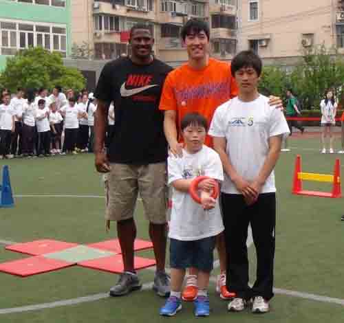 田径比赛是力量、速度、技巧以及耐力的竞争,但是在邓禄普上海田径黄金大奖赛组委会看来,这项国际田联的顶级赛事也有温情的一面。因为,慈善也是这项赛事同样吸引人眼球的地方。尽管离比赛还有一天,但昨天刘翔、大卫·奥利弗和牙买加女飞人维罗尼卡·坎贝尔·布朗还是来到了上海浦东新区辅读学校,为这里的智障儿童“圆梦”。明星们通过轻松的少儿趣味田径项目与众多智障学生们一起度过了愉快的一天。5月14日上午10点半,在浦东新区辅读学校,患有唐氏综合征的小朋友昊昊圆了自己长久以来的一个梦——和刘翔一起奔跑。