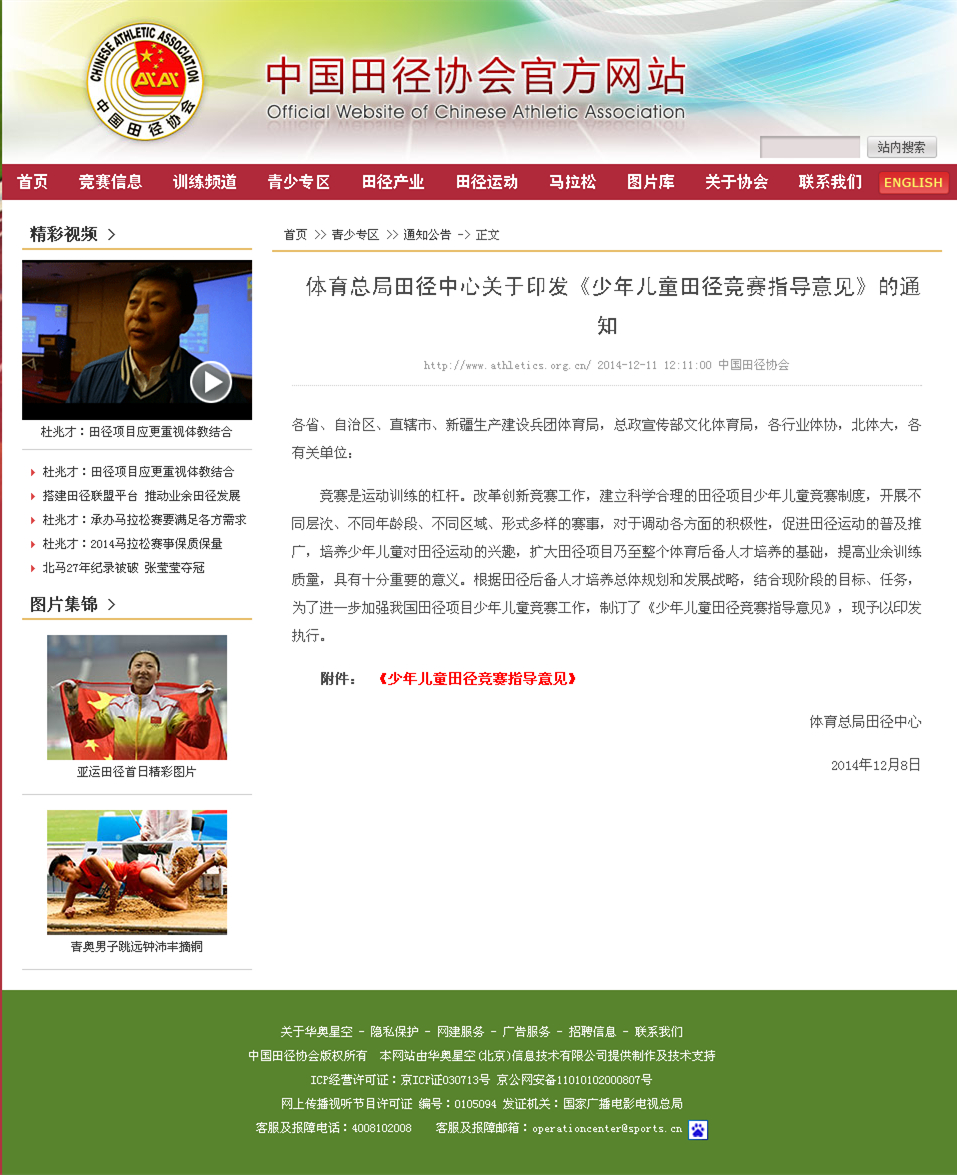 国家体育总局官方网站《少年儿童田径竞赛指导意见》通知网页链接: