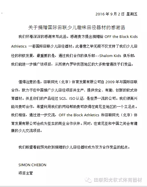 9月2日,田联阳光(北京)体育发展有限公司收到了来自肯尼亚OFF the Block Kids Athletics 公司的一封感谢函,函中,OFF the Block Kids Athletics 公司对田联阳光捐赠体育器材的义举深表感谢,并希望以收到捐赠的器材作为双方合作受益的起点,进一步加深拓宽双方的商业合作。