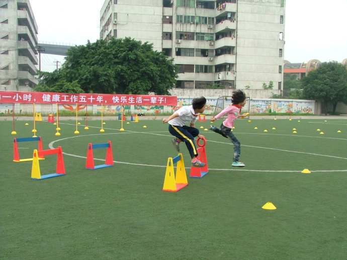 高举“火箭”,看谁扔得远;跪在垫子上,抛空心球; F1赛车一样,像既要转弯又要加速的“一级方程式”组合跑,充满着乐趣……一改传统体育课上简单的跑跳投,孩子们在这样的体育课上,不仅锻炼了身体,还享受到了锻炼带来的快乐。