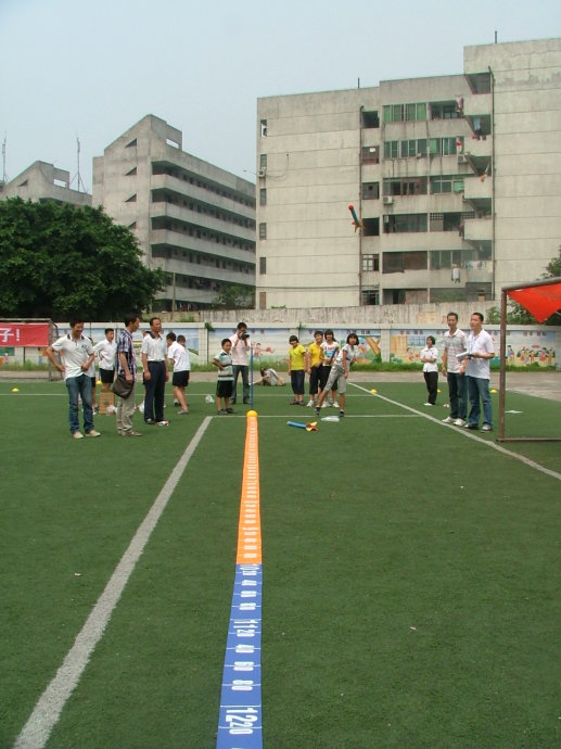 一名体育老师说,这些五颜六色的“火箭”就是用橡胶制成的标枪,“很柔软,不会伤到孩子。”说着,已有孩子忍不住拿起“火箭”跃跃欲试。比赛开始,只见一名孩子单手高举“火箭”,短距离助跑后,奋力往前一掷,“11米。”孩子们连声说:“真好玩”。