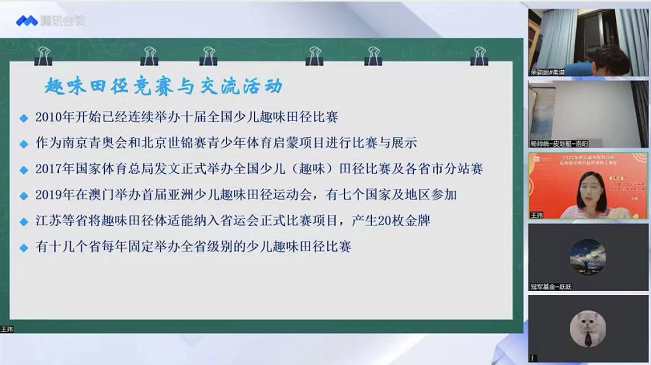 田联阳光应邀参加直播课程《趣味田径在儿童体育教育中的教学与应用》,在直播的过程中,王玮老师就趣味田径项目的起源、幼儿体育活动概述、趣味田径与教学、趣味田径与竞赛 等四个方面给运动员及各位老师做了详细的讲解。