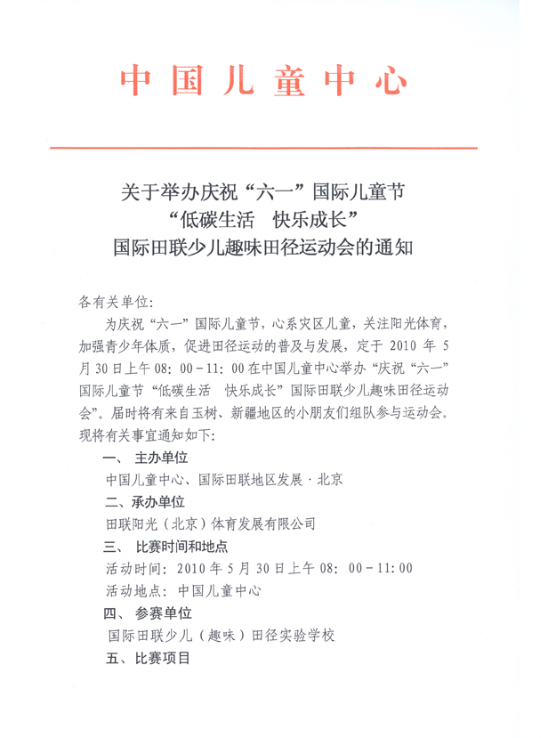 关于庆“六一”“低碳生活 快乐成长”少儿趣味田径运动会的通知