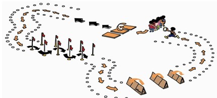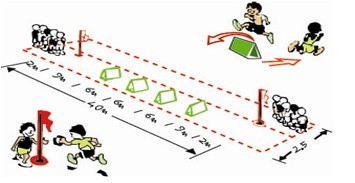 器材的放置如上图所示。每队要有两条跑道,只在一条跑道上放置栏架,另一条跑道不放栏架。每队的第一棒是跨栏跑,第二棒队员接力后短跑。当各队的队员都分别完成了跨栏跑与短跑后(既每个运动员都要完成短跑与跨栏跑)比赛结束。比赛活动中要求队员左手传棒接力。